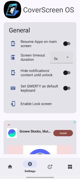 Jeśli MultiStar nie robi na Tobie wrażenia, zawsze możesz wypróbować CoverScreen OS. Ta aplikacja innej firmy umożliwia dostęp do szuflady aplikacji na ekranie głównym za pomocą prostego gestu przesunięcia w górę. Chociaż nie odtwarza estetyki One UI OS, jest znacznie bliższy rzeczywistej szufladzie aplikacji. Jeśli kupisz subskrypcję premium, możesz odblokować więcej funkcji, aby zmaksymalizować potencjał ekranu tytułowego.