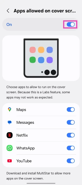Samsung oferuje natywną opcję uruchamiania aplikacji na wyświetlaczu Flipa. Jednak trochę trudno go znaleźć, ponieważ jest ukryty w sekcji „Laboratorium” w Ustawieniach zaawansowanych. Po włączeniu tej funkcji na ekranie tytułowym uzyskasz dostęp do kilku aplikacji. Należą do nich Mapy, Wiadomości, Netflix, WhatsApp, YouTube i inne.