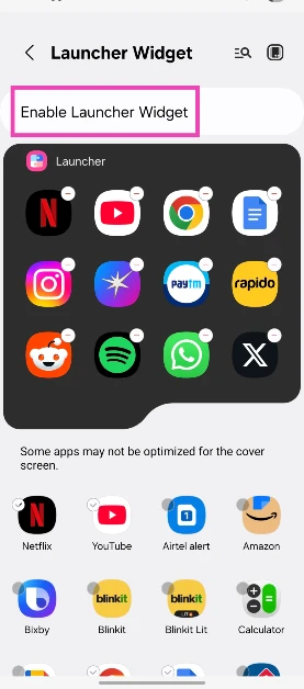 Idź doUstawienia>Funkcje zaawansowane>Laboratoriumi włącz przełącznik obok opcji „Aplikacje dozwolone na ekranie tytułowym”. Pobierz Samsung Good Lock ze sklepu Galaxy i zainstaluj wtyczkę MultiStar. Uruchom wtyczkę i przejdź doI ♡ Galaxy Foldable>Widget Launchera. Wybierz aplikacje, które chcesz wyświetlić na ekranie głównym. Stuknij w „Włącz widżet uruchamiania”, wybierz MultiStart i stuknij w „Widget uruchamiania”.