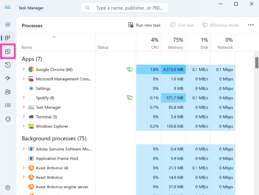 Krok 2:Idź doWydajnośćzakładka na pasku bocznym.