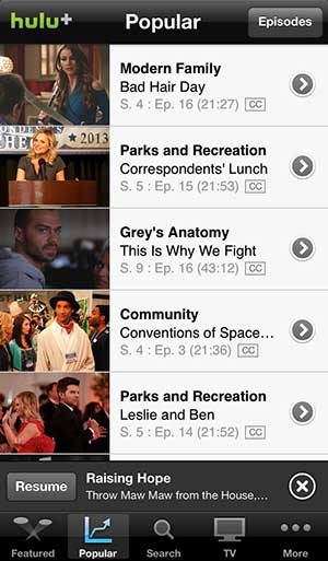 Aplikacja Hulu Plus na iPhone'a 5Hulu Plus koncentruje się bardziej na oferowaniu najnowszych odcinków popularnych programów telewizyjnych, podczas gdy Netflix oferuje filmy i poprzednie sezony programów telewizyjnych.