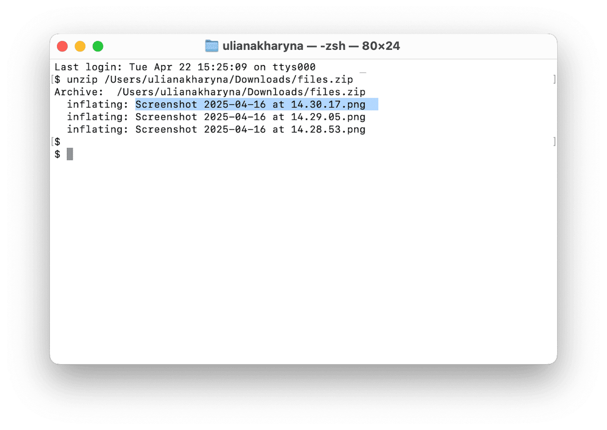 unzip - Przeciągnij archiwum zip do okna terminala i naciśnij klawisz Return.