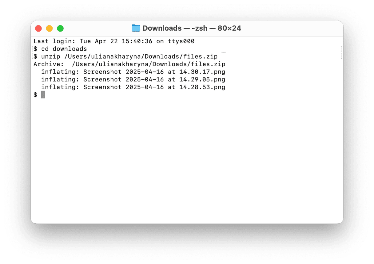 Jeśli chcesz mieć go w konkretnej lokalizacji, wpiszcdpo którym następuje nazwa tej lokalizacji przed uruchomieniemunziprozkaz. Na przykład wpiszcd desktopa następnie Return, jeśli chcesz rozpakować go na komputer lubcd downloadsjeśli potrzebujesz tych plików w folderze Pobrane. Następnie uruchom polecenie.