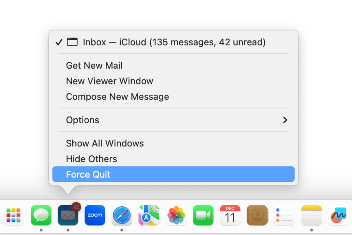 - Trzymając wciśnięty klawisz Opcja, kliknij prawym przyciskiem myszy ikonę aplikacji Poczta w Docku. Kliknij opcję Wymuś zakończenie.