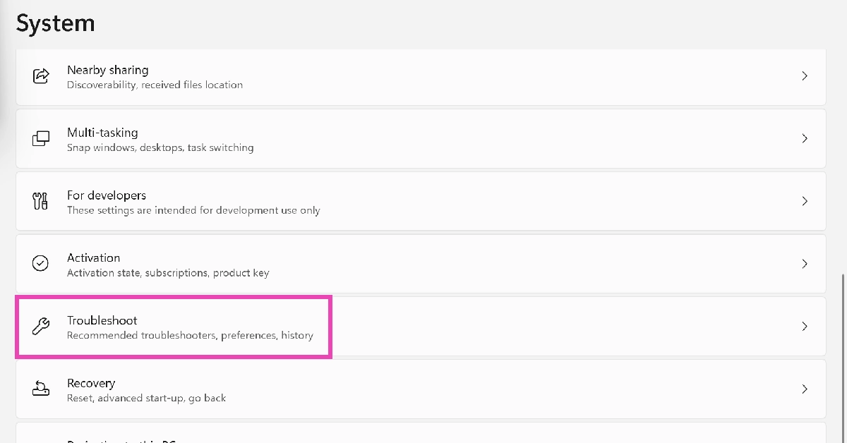 Krok 2:Przewiń w dół i kliknijRozwiązywanie problemów.