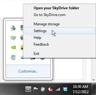 Krok 2: Kliknij prawym przyciskiem myszySkydriveikona, a następnie kliknijUstawieniaopcja.