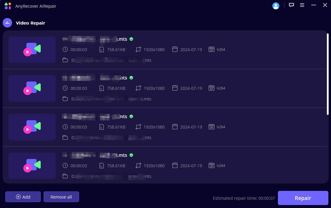 Korzystanie z AnyRecover AIRepair jest również bardzo proste i wymaga kilku kliknięć. Po prostu prześlij filmy, które chcesz naprawić, kliknij przycisk, aby rozpocząć naprawę, a film zostanie automatycznie naprawiony. Jeśli masz wiele filmów do naprawy, to równieżobsługuje naprawę wsadową, który może naprawić wiele filmów jednocześnie i zaoszczędzić dużo czasu. Oto najważniejsze cechy tego produktu: