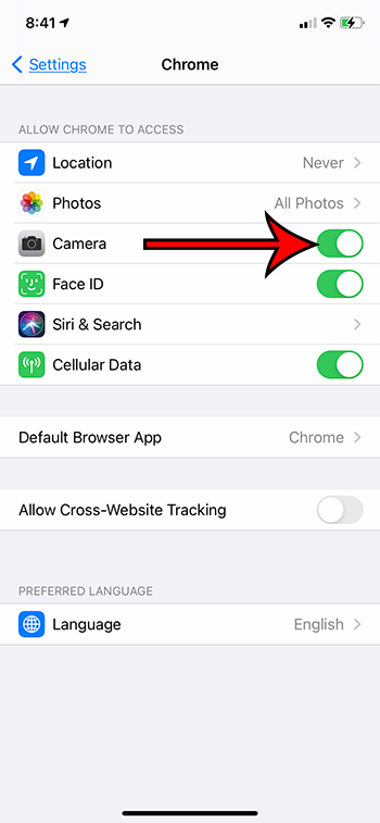 Jeśli korzystasz z przeglądarki internetowej Google Chrome na swoim iPhonie, możesz nadać jej uprawnienia do aparatu, przechodząc doUstawienia > Chrome >następnie dotykając przycisku obokKamera.