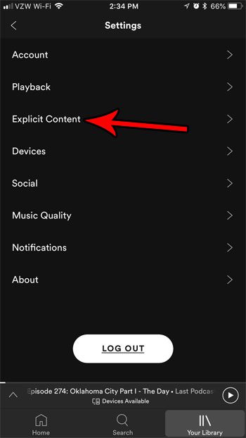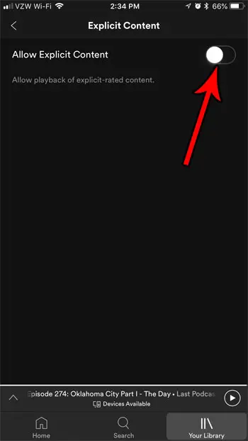 Czynności opisane w tym artykule zostały wykonane na telefonie iPhone 7 Plus z systemem iOS 11.3 i najnowszą wersją aplikacji Spotify, która była dostępna w momencie pisania tego artykułu. Spowoduje to zmianę ustawienia w aplikacji Spotify tak, że utwory oznaczone jako wulgarne będą wyszarzone w wynikach wyszukiwania. Po zmianie tego ustawienia konieczne będzie podanie identyfikatora Touch ID, aby włączyć je ponownie. To ustawienie wydaje się najbardziej odpowiednie dla rodzica, który pozwala dziecku słuchać muzyki na telefonie rodzica i chce mieć pewność, że dziecko przypadkowo nie usłyszy niczego wyraźnego. To ustawienie można bardzo łatwo przywrócić, jeśli jest to urządzenie własne dziecka i zarejestrowany jest na nim jego odcisk palca.