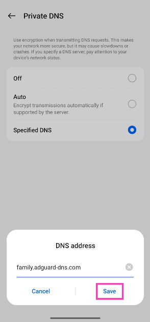 Krok 4:Wprowadźnazwa hostadostawcy DNS. Na przykład,dns.adguard-dns.comLubrodzina.adguard-dns.com.