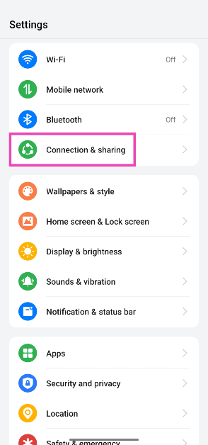 Krok 1:Idź doUstawieniai wybierzPołączenia i udostępnianie.