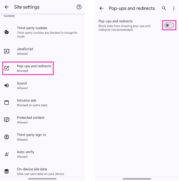 Krok 4:WybieraćWyskakujące okienka i przekierowaniai wyłącz jego przełącznik.