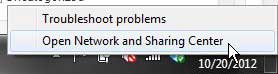 Krok 1: Kliknij prawym przyciskiem myszy ikonę sieci na pasku zadań w prawym dolnym rogu ekranu, a następnie kliknij opcję Otwórz Centrum sieci i udostępniania.