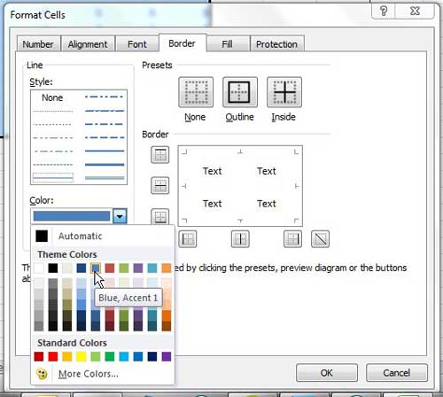 Ważne jest, aby wykonać kroki w tej kolejności, aby ustawić kolory obramowania; w przeciwnym razie program Excel 2010 będzie nadal stosować do komórek czarne obramowanie.
