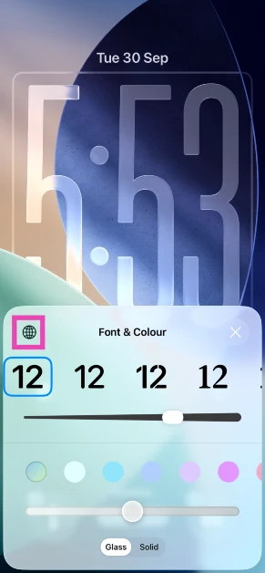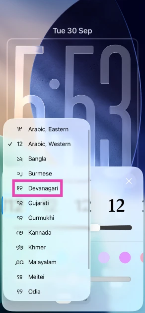 Idź doUstawienia>Tapeta, na panelu ekranu blokady kliknij „Dostosuj”. Kliknijwidget zegarai naciśnij ikonę globusa w wyskakującym menu. Wybierz skrypt z listy i naciśnij „Gotowe”.