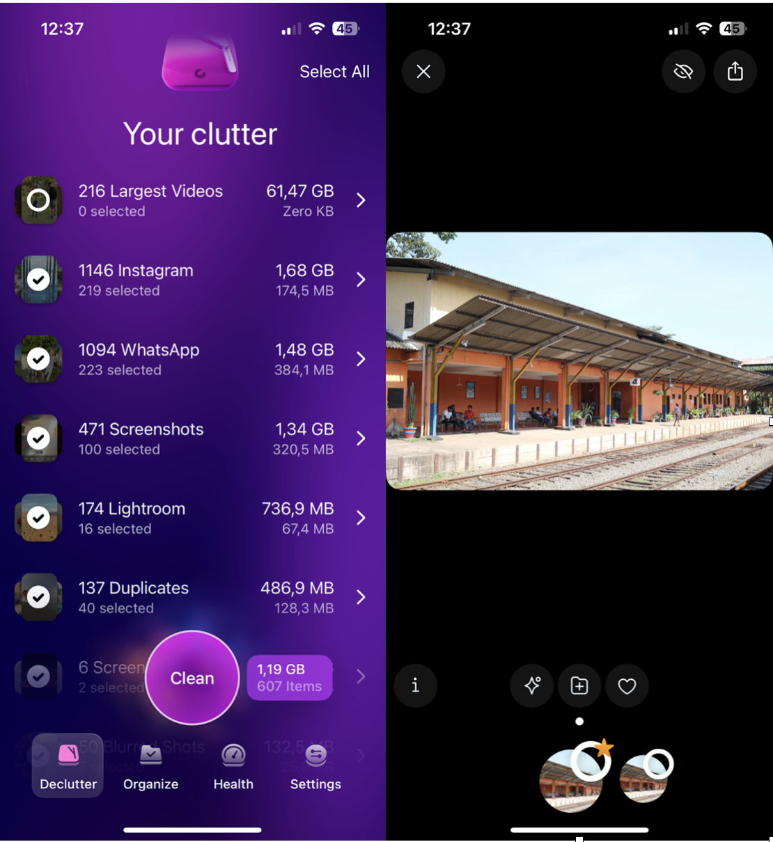 Skorzystaj z modułu Declutter zWyczyść mój telefonaby usunąć mnóstwo niechcianych multimediów. Skanuje Twoje zdjęcia i grupuje bałagan w przejrzyste segmenty, takie jak duplikaty, podobne, zrzuty ekranu, nagrania ekranu, zamazane, duże filmy i foldery aplikacji. Te foldery aplikacji wyświetlają multimedia, które aplikacje zapisują w Twojej bibliotece, np. WhatsApp i Instagram, dzięki czemu możesz je przeglądać i usuwać w jednym miejscu. Oto jak: