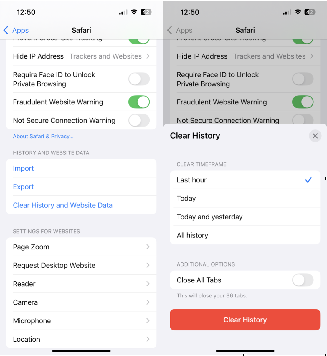 Przewiń w dół i znajdź Wyczyść historię i dane witryny.