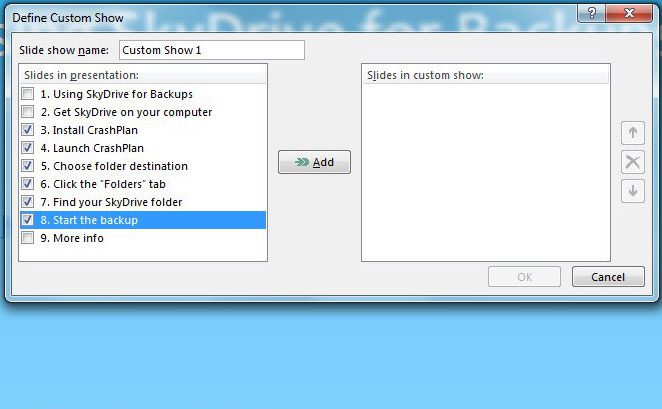 Krok 5: Zaznacz pole po lewej stronie każdego slajdu, którego chcesz użyć, a następnie kliknijDodaćprzycisk na środku okna. Pamiętaj, że możesz także zmienić nazwę pokazu niestandardowego w plikuNazwa pokazu slajdówpole w górnej części okna. Po dodaniu wszystkich slajdów kliknij przyciskOKprzycisk.