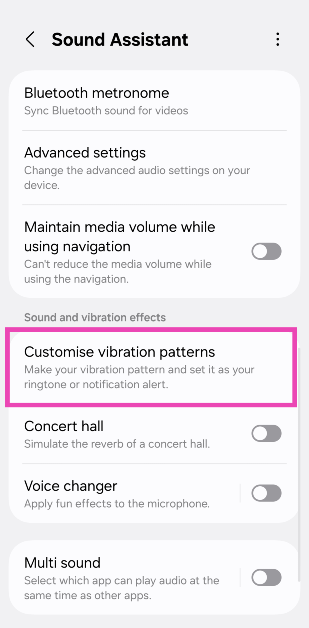 Użytkownicy Samsunga mogą skorzystać z wtyczki Sound Assistant w aplikacji Good Lock, aby utworzyć niestandardowy wzór wibracji dla dzwonków i powiadomień. Idź doAsystent dźwięku>Dostosuj wzorce wibracji, naciśnij ikonę plusa i dotknij ekranu, aby utworzyć wzór dotykowy.