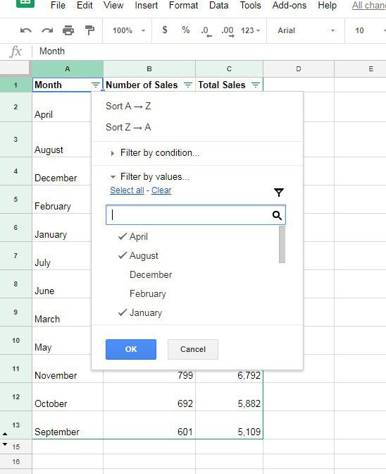 Krok 5: UżyjFiltruj według warunkuIFiltruj według wartościsekcji tego menu, aby dostosować dane, które chcesz wyświetlić. Możesz także skorzystać zSortuj wedługw górnej części menu, aby zmienić sposób sortowania danych. Gdy już skończysz, kliknijOKprzycisk na dole menu.
