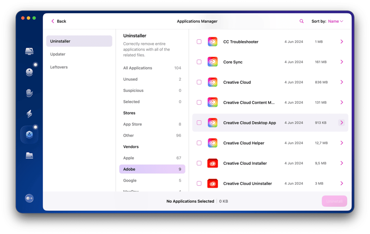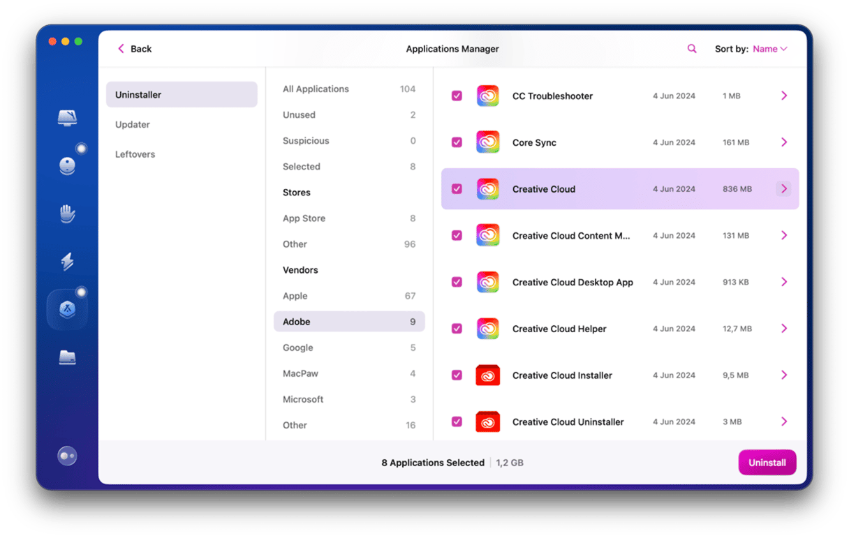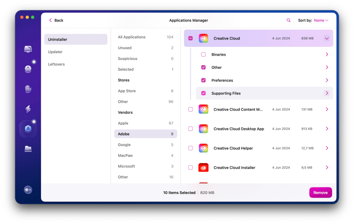 Oto, kiedy funkcja aplikacji w CleanMyMac znów się przydaje. Znajdź Creative Cloud na liście aplikacji, zaznacz wszystkie jej pliki oprócz plików binarnych i kliknij Usuń. To wszystko!
