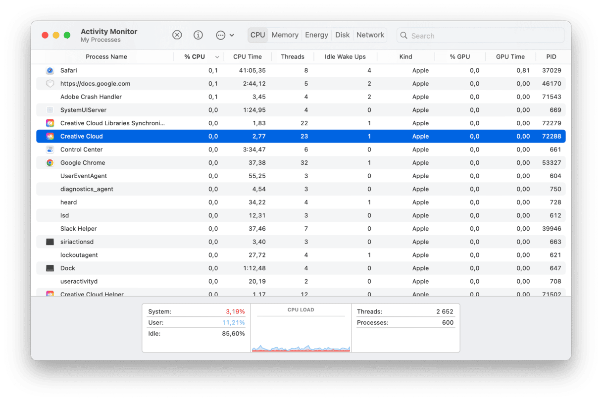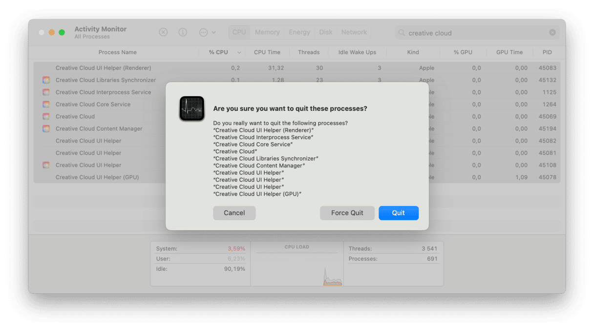 - Upewnij się, że zamknąłeś wszystkie procesy związane z CC za pomocą Monitora aktywności.