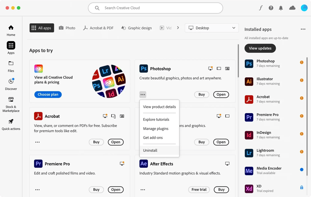 - Odinstaluj wszystkie aplikacje Creative Cloud, takie jak Photoshop, Premiere Pro lub Illustrator — przechowywanie ich na komputerze Mac nie pozwoli na usunięcie aplikacji Creative Cloud na komputer.