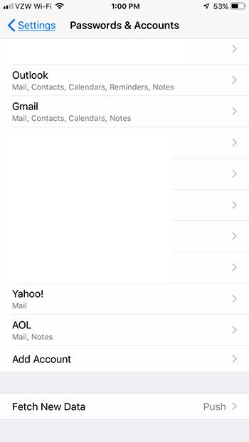 Pamiętaj, że w niektórych wcześniejszych wersjach systemu iOS nie ma menu Hasła i konta, więc zamiast tego musisz przejść przez menu Poczta, Kontakty i Kalendarze. Możesz przeczytać ten artykuł, jeśli chcesz dostosować domyślne konto pocztowe po dokonaniu tej zmiany.