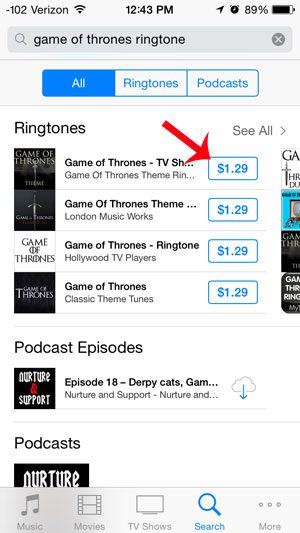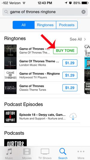 Krok 3: Wyszukaj dzwonek, który chcesz kupić, a następnie wybierz odpowiedni wynik wyszukiwania. W poniższym przykładzie szukamy dzwonka piosenki przewodniej serialu „Gra o tron”.