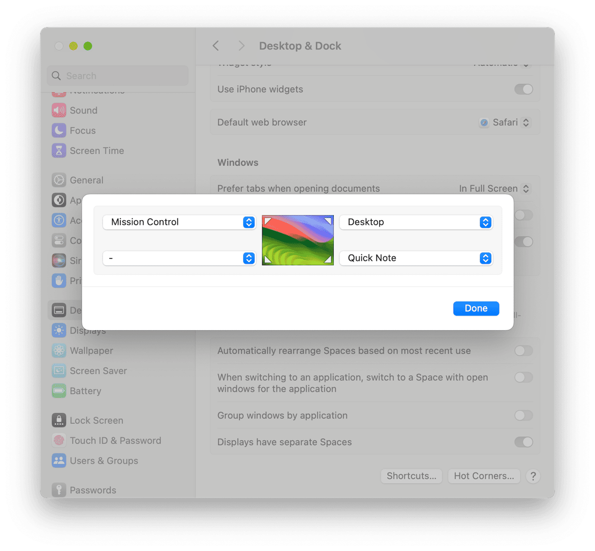 - Przejdź do opcji Pulpit i stacja dokująca > Gorące narożniki.