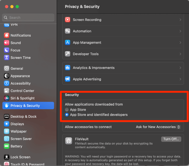 Podobnie jak w przypadku powyższego odtwarzacza VLC Media Player, musisz upewnić się, żeApp Store i zidentyfikowani programiściopcja jest wybrany wUstawienia prywatności i bezpieczeństwa.