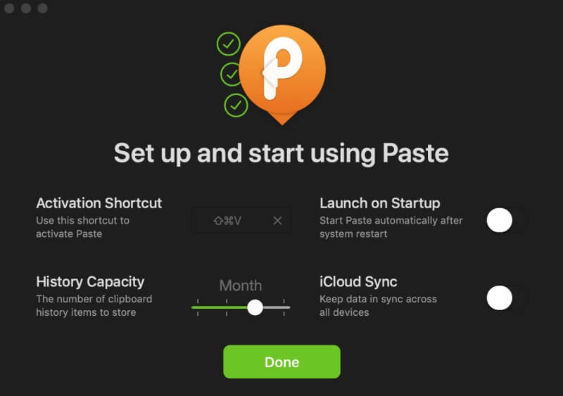 Aby rozpocząć, zainstaluj Wklej. Zobaczysz szybki ekran startowy z kilkoma ustawieniami i będziesz gotowy do pracy!