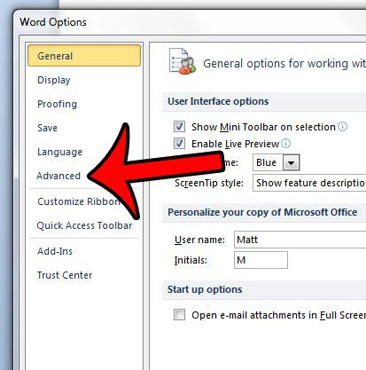 Krok 4: KliknijZaawansowanyzakładka w lewej kolumnieOpcje słówokno.