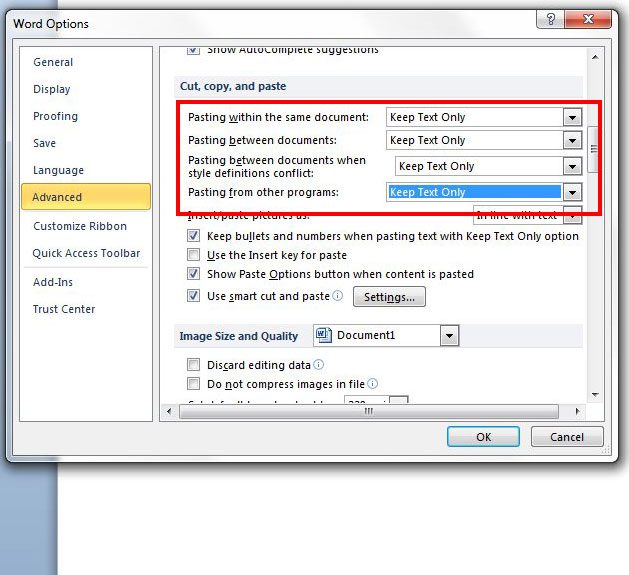 Możesz zmienić każde z tych ustawień indywidualnie, ale nasz przykład poniżej zmieni je wszystkie, tak że do dokumentu programu Word 2010 będziesz wklejał tylko zwykły tekst.