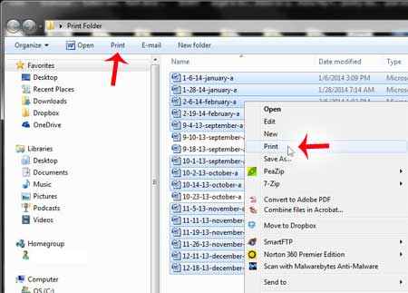 Krok 3: KliknijWydrukowaćna niebieskim pasku u góry okna lub kliknij prawym przyciskiem myszy jeden z wybranych plików i kliknijWydrukowaćopcja.