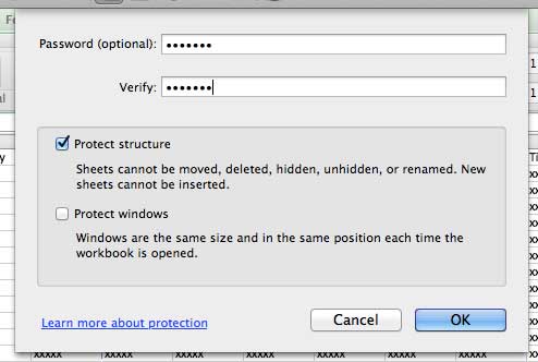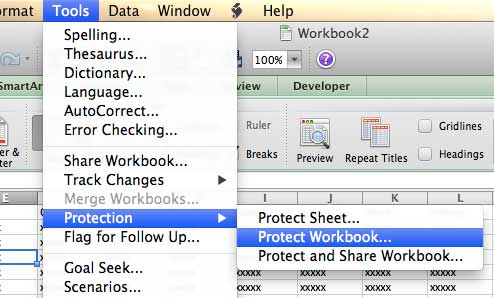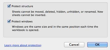 TheOchronafunkcja w programie Excel 2011 faktycznie pozwala określić między ochroną niektórych elementów aktualnie aktywnego arkusza a ochroną struktury całego skoroszytu.
