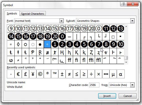 Możesz używać różnych elementów jako punktorów, wybierając je z menuSymbolikamenu naWstawićzakładkę, klikając symbol w menu, a następnie klikając przyciskWstawićprzycisk, aby wstawić go do komórki.
