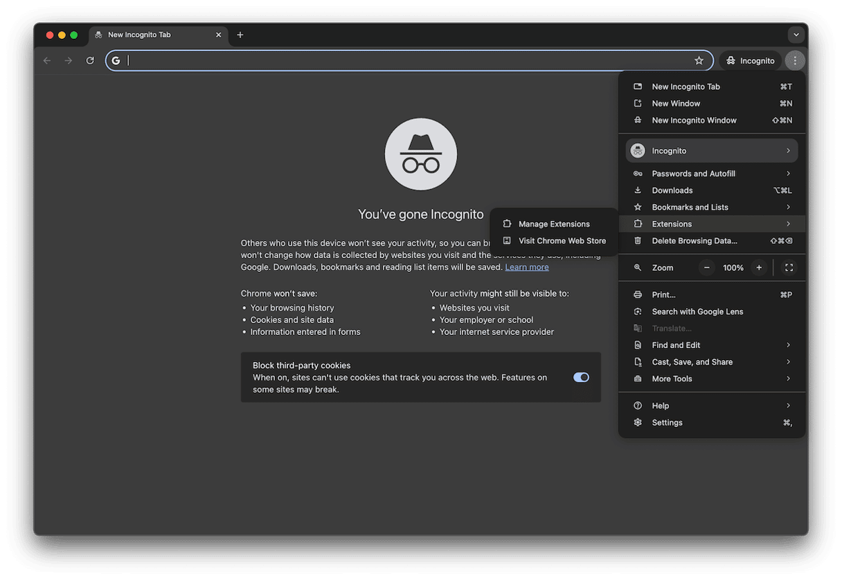 - Kliknij trzy poziome linie > Ustawienia > Rozszerzenia i motywy.