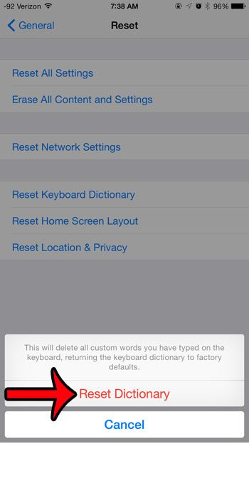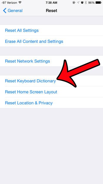 Krok 4: DotknijZresetuj słownik klawiaturyprzycisk. Jeśli masz ustawione hasło na swoim urządzeniu, musisz je wprowadzić przed kontynuowaniem.