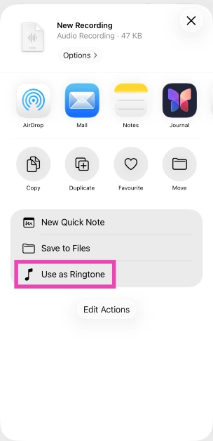 Uruchom aplikację Pliki, przejdź do pliku audio, naciśnij i przytrzymaj plik, dotknij „Udostępnij” i wybierz „Użyj jako dzwonka”. Ta metoda wymaga aktualizacji iPhone'a do iOS 26.