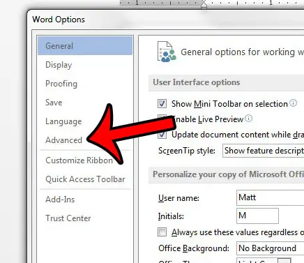 Krok 4: KliknijZaawansowanyzakładka po lewej stronieOpcje słówokno.