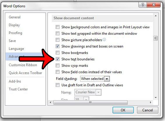 Krok 5: Przewiń w dół doPokaż treść dokumentusekcji menu, a następnie zaznacz pole po lewej stroniePokaż granice tekstu. KliknijOKw dolnej części okna, aby zastosować zmiany.