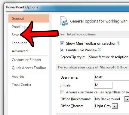Krok 4: KliknijRatowaćzakładka w lewej kolumnieOpcje Powerpointaokno.