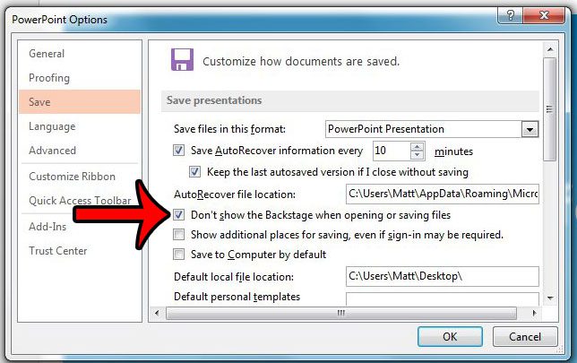 Krok 5: Zaznacz pole po lewej stronieNie pokazuj Backstage podczas otwierania lub zapisywania plikówopcja.