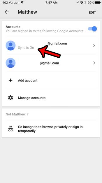 Krok 5: Kliknij konto zawierająceSynchronizacja jest włączonaetykietka.