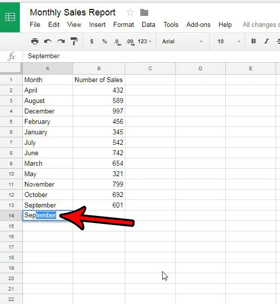 Kroki opisane w tym artykule zapobiegną udostępnieniu w Arkuszach Google opcji autouzupełniania podczas wpisywania danych. Mamy tu na myśli tekst zaznaczony na niebiesko, który pojawia się, gdy zaczynasz wpisywać słowo, które już znajduje się w arkuszu. Na przykład na obrazku poniżej Arkusze udostępniają opcję autouzupełniania słowa Wrzesień, gdy wpisuję kilka pierwszych liter tego słowa.