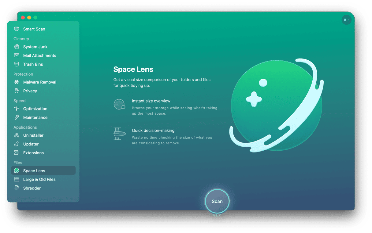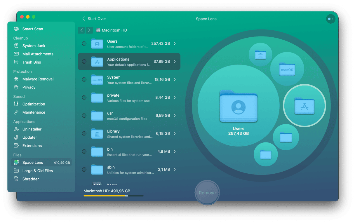 Możesz niezawodnie zyskać przestrzeń i moc obliczeniową potrzebną do poprawy wydajności komputera Mac, pobierając CleanMyMac. Zawiera narzędzie Space Lens, które w ciągu kilku sekund może utworzyć mapę pamięci i wyświetlić wszystkie pliki i foldery na komputerze Mac.