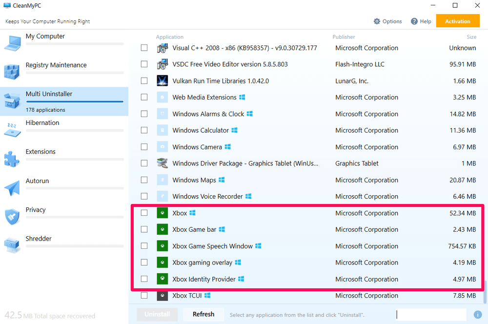 Po zainstalowaniu CleanMyPC otwórz program i wybierz „Multi Uninstaller”. Na tej liście znajduje się aplikacja Xbox, którą można odinstalować, jeśli chcesz. Po prostu zaznacz pola, a następnie naciśnij zielony przycisk „Odinstaluj”.