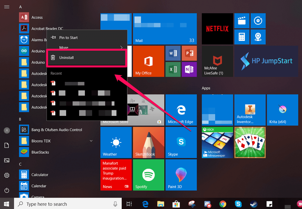 Jeśli nie chcesz grzebać w ustawieniach, możesz także odinstalować bezpośrednio z menu Start. Aby to zrobić, naciśnij klawisz Windows na swoim komputerze lub kliknij ikonę w lewym dolnym rogu. Powinieneś zobaczyć listę aplikacji. Kliknij prawym przyciskiem myszy dowolną aplikację i wybierz „Odinstaluj” z menu rozwijanego.