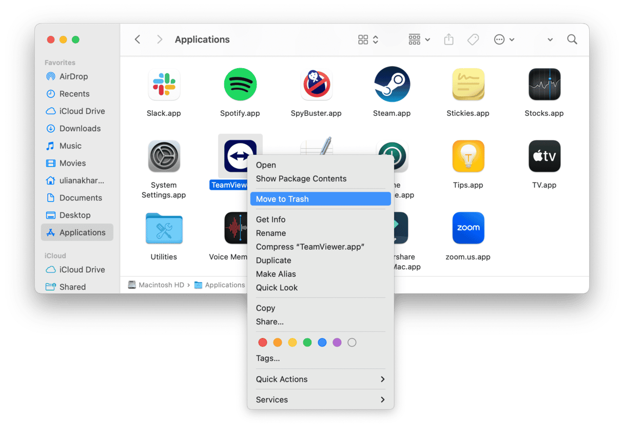 Jeśli nie chcesz korzystać z Terminalu, możesz także odinstalować TeamViewer ręcznie, lokalizując pliki w Finderze i przeciągając je do Kosza. Będziesz musiał poszukać w kilku różnych miejscach, aby znaleźć wszystkie pliki rozproszone na dysku.